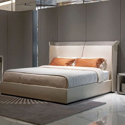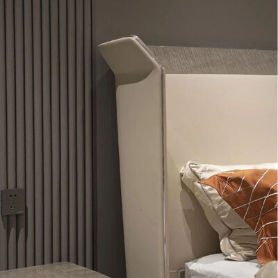 Modern New Design Brown Wooden Double Beige Velvet Leather Bed Room Suite Modern Luxury Home Furniture King Size Bed Design