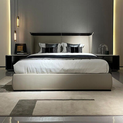 Modern New Design Brown Wooden Double Beige Velvet Leather Bed Room Suite Modern Luxury Home Furniture King Size Bed Design 16