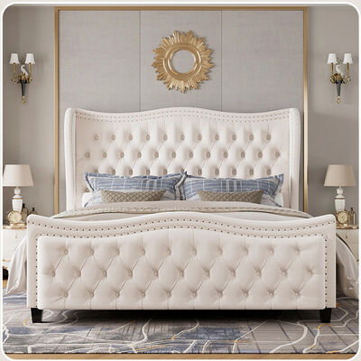 Kainice Luxury White Velvet Upholstery Deep Button Headboard for Queen Beds Shelter Side Wavy Tufted Design Bed Frame 0